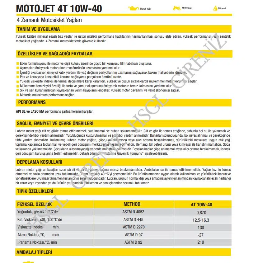 | Etiketler | HSGL Lubran 4T MotoJet 10W-40 API SL Motor Yağı 1 Litre Yüksek Performanslı 4 Zamanlı Motosiklet Yağ |